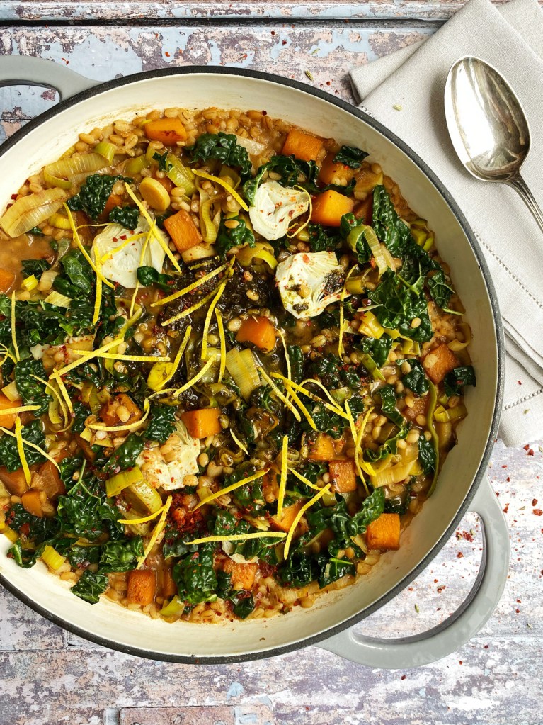 High up in the hills of Umbria, winters can be long and very cold. A chilled silence wraps itself around the small towns and villages like a damp white cloak and the region falls into a kind of reflective slumber until Easter. Restaurants – at least those that choose to remain open after the feasting of Christmas – are cozy with open fires and menus featuring regional comfort foods like fresh egg tagliatelle topped with rich sauces, heirloom legume soups and earthy mushroom and truffle-based dishes all of which are designed to sustain you ahead of a long walk in the the countryside. This soup, a beautiful melange of deeply comforting barley gently cooked with a few winter vegetables and stirred through with a bright squeeze of lemon and a slick of rich oily pesto, is just perfect for a snow day such as today providing you with the self love that you so richly deserve.