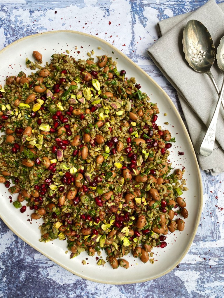 The vibrant and colourful Souk el Tayeb – literally translated as ‘the good market‘ – in central Beirut is famed for the way it showcases the produce of local farmers and the very best of Lebanon’s organic ingredients; it’s literally a deep dive into the rich and inspiring culinary traditions of the Middle East. The peoples of Lebanon are justifiably proud of their ancient tradition of community growing and small-scale agricultural production which means that you can be sure that pretty much everything you pick up there will be grown with a deep sense of pride, passion and love. For me, a slow meander through the market on a slow Saturday morning is a thrilling experience that renders me all but speechless with excitement and awe. This super simple salad is a celebration of all that. It’s the perfect summer dish as the satisfyingly chewy texture of the nutty grain is beautifully offset by the piquancy of the pomegranate molasses and the vibrancy of the seasonal fruity arils and herbs. It’s literally a celebration on a plate and the perfect addition to the mezze table.