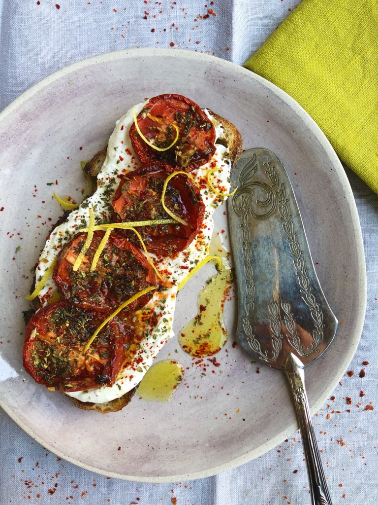 To assemble, toast the sourdough and rub it with garlic. Spread generously with the whipped feta and place the tomatoes on top. Drizzle with olive oil and garnish with the lemon zest, a light sprinkling of wild oregano and hibiscus petals (if using).