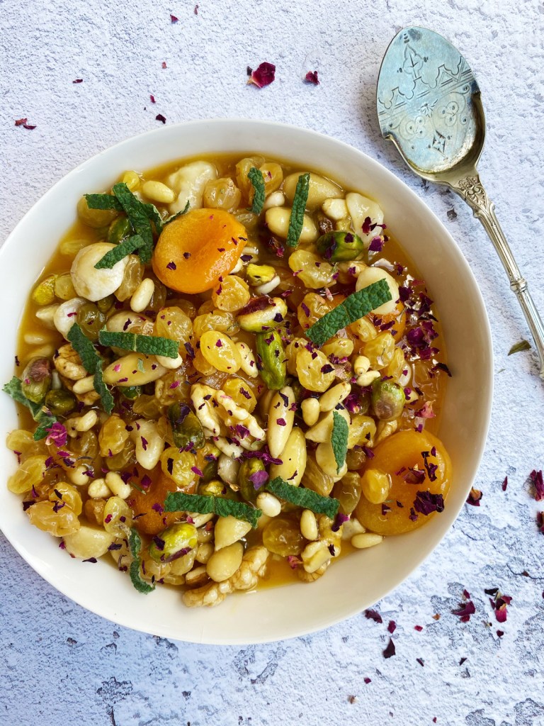Add the drained nuts to the fruit and apricot juice. Stir in the orange blossom water and garnish with mint and rose petals.