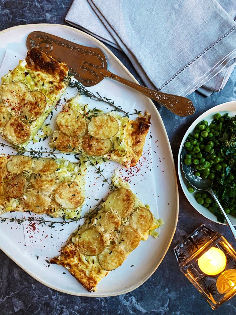 Taking care not to go over the scored edge, smother the pastry with the leek mixture and top with the sliced potatoes and the grated cheese.