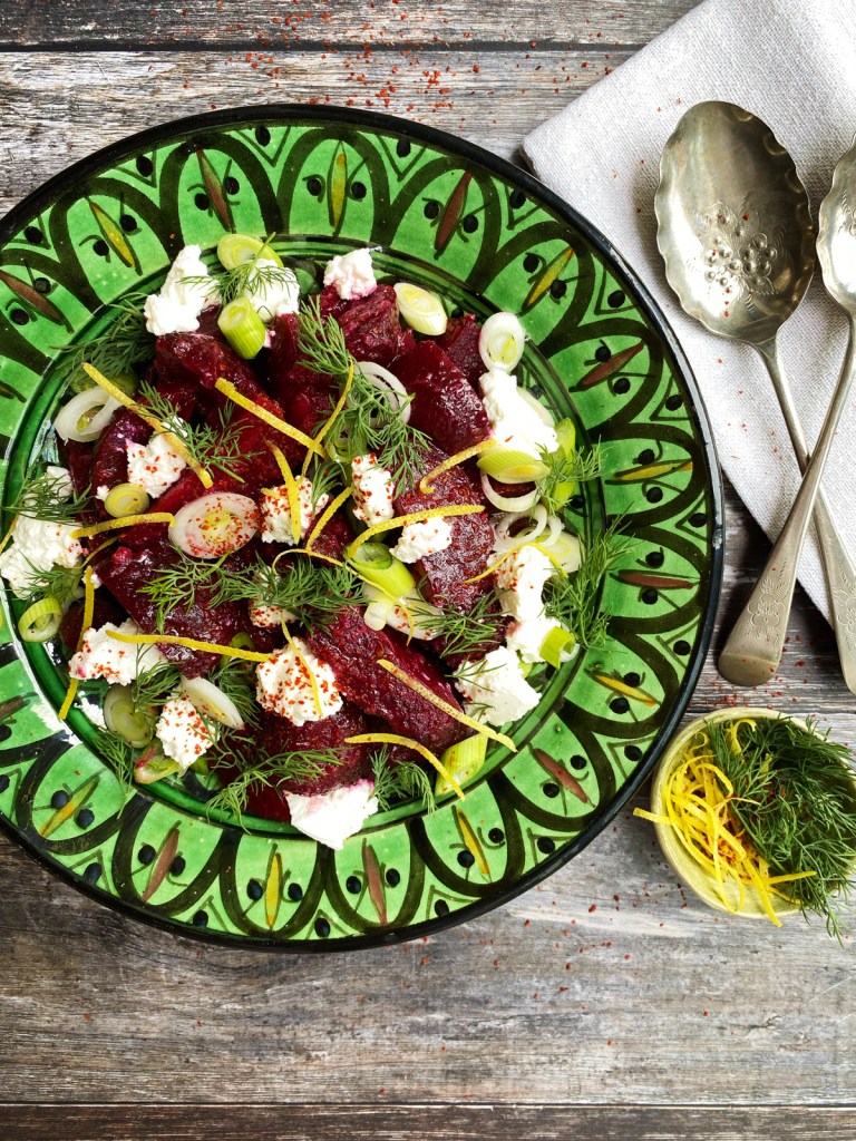 Whilst holidaying in the harbour town of Symi in August, we were invited to lunch by my friend Nephele, the lucky custodian of one of those beautiful pastel-coloured neo-classical villas that slowly wind up the herb-covered hills that rise up from the sea. Hers is buttercup yellow. Inside, the huge middle floor is open plan to accommodate a rustic yet sophisticated kitchen with a large oak table, eight chairs and a day bed carelessly strewn with vintage white linen. The four French windows were open to a sun barely tempered in its fierce heat by curtains of white muslin billowing in the breeze. Lunch was a simple affair of grilled Kefalotyri cheese drizzled with golden strands of sweet honey, freshly baked fennel seed bread, a large antique plate of lightly dressed foraged greens and this sublime beetroot salad. Make it ahead and leave in the fridge for several hours to allow the flavours to gently mingle.