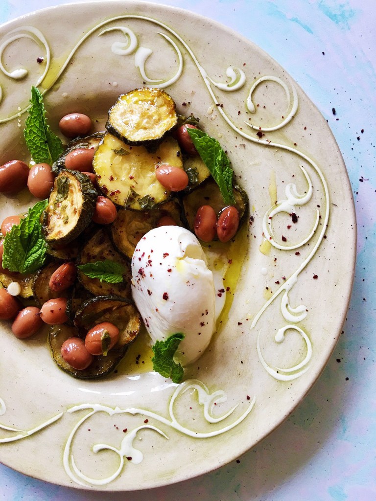 To serve, bring up to room temperature and place on a plate with the mozzarella and borlotti beans, drizzle with olive oil and scatter with fresh mint leaves and a pinch of sumac.