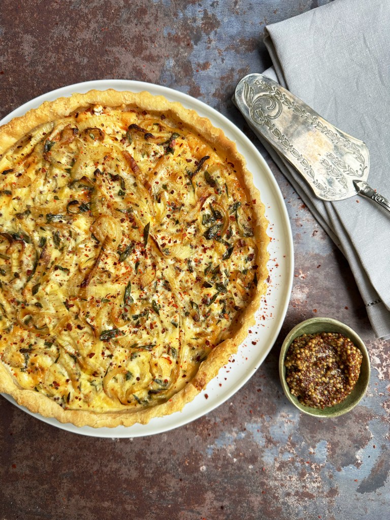 Although this classic savoury French tart originates from the Alsace region in France, this version is inspired by a misty autumnal day spent picking apples in Normandy before crisscrossing the Suisse Normande – a wild, hilly stretch of the Orne valley just to the south of Caen – in search of a bottle of aged Calvados for our Christmas table. We returned with a couple of creamy local cheeses which we didn’t get around to finishing so this is how I used them up. This is a great recipe to bookmark for a lovely post-Christmas lunch designed to use up all your odds and ends of cheese because, to be truthful, anything goes here.