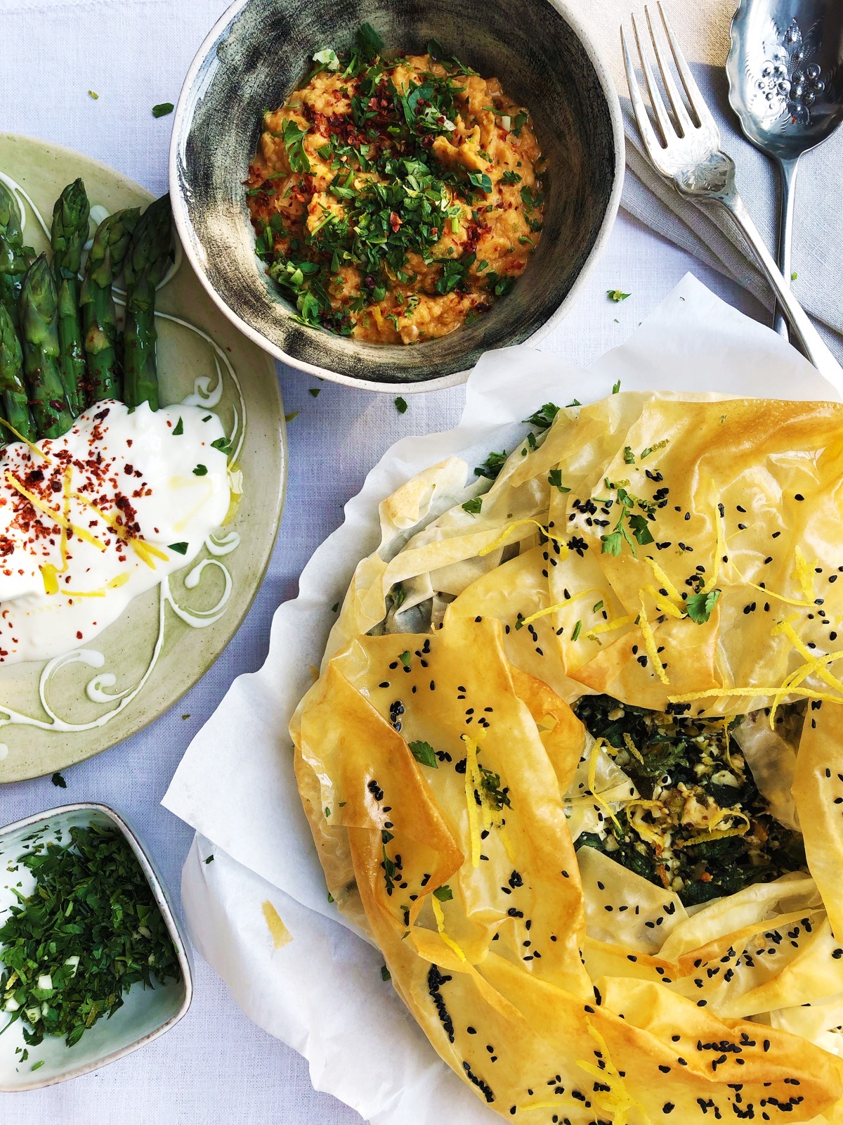 Imagine a table covered with the softest hand woven linen, wonky bowls and plates, glistening glasses, mismatched cutlery, creamy candles and vases of hand picked flowers. Upon that table is a feast of healthy, seasonal vegetarian dishes that have been elevated into something really special through the liberal use of herbs, spices and interesting ingredients gathered from our travels around the countries that kiss the coast of the Mediterranean from the delicately fragrant hills of France, Italy and Greece to the big gutsy flavours of Turkey, Lebanon and Palestine.